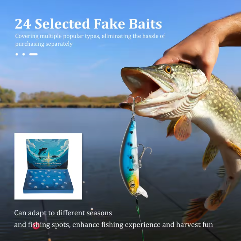 A 24-day fishing advent calendar packed with 24 curated lures—6 topwater, 6 soft, 10 spoons plus minnows, crankbaits, frogs & shrimp.
